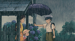 À la sortie des cours, sur le chemin du retour, les deux sœurs sont surprises par une averse. Elles s'abritent sous l'auvent d'un petit temple bouddhiste. Quelques minutes plus tard, elles sont rattrapées par Kanta, qui arrive à son tour sur le chemin, protégé par un parapluie. Le jeune garnement s'arrête dans son élan en apercevant les deux sœurs. Il hésite, puis reprend sa marche en cachant son visage derrière son parapluie. Satsuki s'est elle aussi aperçue de la présence de Kanta et ne dit rien. Le garçon les dépasse sans rien dire, et brusquement, se retourne et leur laisse son parapluie avant de s'enfuir en courant sous le déluge, un sourire satisfait dessiné sur le visage. Satsuki et Mei reprennent leur chemin sous le parapluie de Kanta. C'est un vieux parapluie plein de trous mais Satsuki a tout de même le cœur réchauffé par l'attention de Kanta. De retour à la maison, Satsuki s'aperçoit que son père a lui-même oublié son parapluie et décide de venir l'attendre avec à l'arrêt de bus. Satsuki et Mei passent d'abord chez les voisins pour rendre celui de Kanta, à la grande surprise de la mère. Persuadée que son fils l'avait perdu, elle l'avait déjà disputé !
