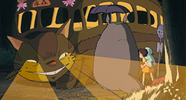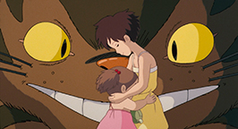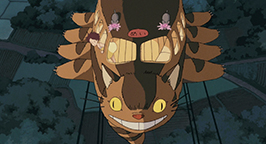 C'est à ce moment que des lumières de phares se rapprochent au loin. Ce doit être le bus qui ramène leur père pensent Mei et Satsuki. Mais ce qui arrive à toute allure et stationne devant eux est un énorme chat à douze pattes en forme de bus ! Stupéfaites, elles observent sa tête se tourner vers elles et leur lancer un large sourire, tandis qu'une porte se dessine pour laisser entrer les voyageurs. Totoro tend un petit sac en feuilles en cadeau aux fillettes et monte dans le Chat-bus. Ce dernier démarre aussitôt et reprend sa course folle avant de disparaître derrière une colline, laissant les fillettes sans voix. L'esprit sans doute trop confus par cette incroyable rencontre, Satsuki ne parvient qu'à marmonner que Totoro a gardé le parapluie de son père…
