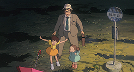 L'attente est longue à l'arrêt de bus. Un premier bus arrive mais Monsieur Kusakabe n'est pas dedans. Le suivant se fait encore plus attendre. Les réverbères s'allument et un dernier cycliste se dépêche se rentrer chez lui pour échapper à la pluie qui ne semble pas vouloir s'arrêter. Son passage laisse ensuite la route et les alentours désespérément déserts. Mei commence à être fatiguée de patienter et de jouer dans les flaques d'eau mais elle refuse d'aller attendre chez les voisins. Satsuki la prend sur son dos pour lui permettre de dormir. La pluie continue de tomber, Mei s'est endormie tandis que sa sœur continue de patienter. Dans le froid et le noir, alors que tout est calme, des bruits de pas lourds se rapprochent des fillettes. La vue à moitié masquée par son parapluie, Satsuki aperçoit alors une grosse patte pourvue de longues griffes qui grattent un imposant corps poilu. Elle tend le cou pour voir ce qui vient de se poster à côté d'elle. Satsuki n'en croit pas ses yeux : c'est le gros Totoro dont parlait sa sœur qui vient lui aussi attendre le bus !