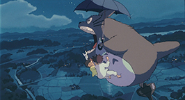 À son pied, Satsuki et Mei ne peuvent contenir leur enthousiasme et hurlent de joie. La magie de cette nuit continue, Totoro sort une toupie qui entre en lévitation. Il monte dessus et le moyen et le petit Totoro sautent sur sa poitrine. Sans hésiter, Mei en fait de même. À son invitation, Satsuki rejoint Totoro. La toupie s'élève alors dans le ciel, portée par le vent. Totoro offre aux deux fillettes un vol nocturne à travers la campagne, frôlant la cime des arbres et traversant les champs pour finir par repartir vers le ciel, vers la plus haute branche de l'arbre sorti de terre. À l'intérieur de la maison, Monsieur Kusakabe, en plein travail, croit entendre la mélodie du vent. Comment pourrait il se douter que se sont ses deux filles qui jouent de l'ocarina en compagnie de leurs nouveaux amis ? Au matin, Mei et Satsuki sautent de joie. Dans le jardin, l'arbre géant a disparu, mais ô surprise, les graines ont germé. Les pousses ne font que quelques centimètres mais les filles sautent de joie sous le regard attendri de leur père.