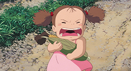 Quelques temps plus tard, on retrouve Mei et Satsuki qui aident Grand-mère à cueillir les légumes dans le champ de la famille de Kanta. Les fillettes sont heureuses car il est prévu que leur mère revienne à la maison samedi. Mei prévoit déjà de lui offrir l'épi de maïs qu'elle vient de cueillir dans le champ. C'est alors que Kanta surgit avec un télégramme de l'hôpital demandant de rappeler rapidement. Paniquée, Satsuki demande conseil à Grand-mère : son père est à l'université et ne rentrera pas avant le soir ! En voyant sa grande sœur si perturbée, Mei ne se sent pas tranquille. Satsuki et Kanta s'élancent vers la maison de celui-ci pour téléphoner. Son épi fermement serré dans ses bras, Mei essaye de les suivre malgré la demande de sa sœur de rester avec Grand-mère. Arrivée chez Kanta, Satsuki téléphone à l'université et fait part de la nouvelle à son père. Celui-ci la rassure et lui promet de la rappeler dès qu'il aura contacté l'hôpital. Satsuki s'agenouille et attend sans rien dire. Pendant ce temps, Mei, qui a perdu la trace de sa grande sœur, erre sur le chemin. Une chèvre veut lui dérober son épi qu'elle protège avec véhémence.