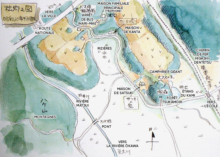 La camionnette s'arrête prêt de deux colonnes de béton qui marquent l'entrée de leur nouveau foyer. C'est une vieille maison japonaise traditionnelle, dotée d'une pièce séparée « à l'occidentale », restée longtemps inhabitée avec un immense jardin. Un peu en hauteur, bâtie sur une petite colline, elle avoisine à l'Est un petit temple shintô dédié à la végétation de la forêt Tsukamori. En face, coule une petite rivière derrière laquelle les rizières s'étendent jusqu'aux monts Hake. Sans même attendre leur père, Satsuki et Mei s'élancent avec excitation à la découverte de leur nouvelle demeure. Les deux fillettes n'ont jusque là connu que la grande ville et elles sont très heureuses d'arriver dans une région où la nature est si belle. D'ailleurs, derrière la maison, elles ne manquent pas de remarquer l'immense et majestueux camphrier qui s'élève en lisière de forêt.