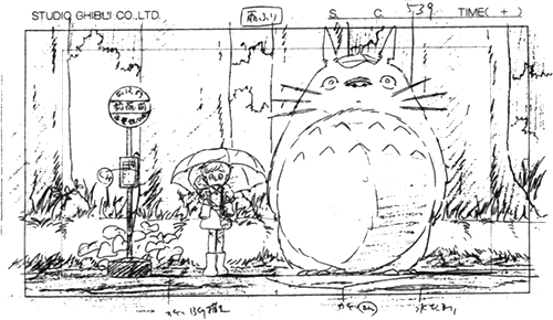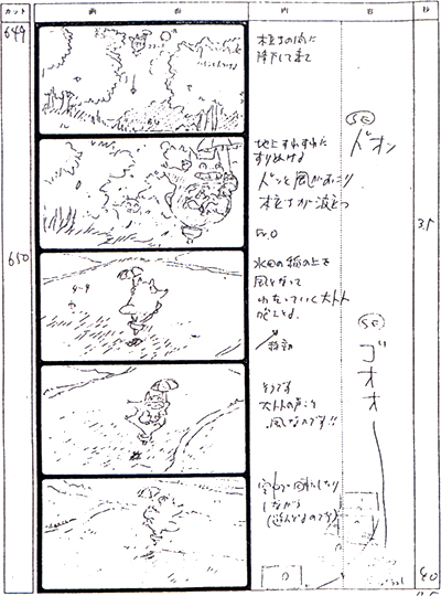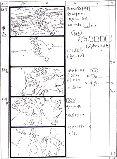 Extrait E-konte (storyboard) par Hayao Miyazaki.