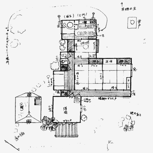 Plan de la maison de la famille Kusakabe par Hayao Miyazaki afin de respecter un espace cohérent entre les scènes.