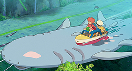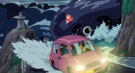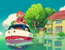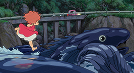 Enfin, on pourrait considérer Ponyo comme un film aquatique loin des nuages et des vents chers à Miyazaki, étant donné le sujet général de l’œuvre. Cependant, celle-ci se déroule plus sur la mer que sous la mer. Les scènes sous-marines ne sont au total qu'au nombre de trois, la scène d’introduction, la scène où Ponyo est enfermée chez Fujimoto et la scène finale. En revanche, les scènes se déroulant sur la mer sont parfois dignes des plus grandes envolées de Miyazaki, notamment celle du tsunami, où Ponyo semble littéralement courir au-dessus des vagues et s’élancer telle un poisson volant à la poursuite de la voiture de Sôsuke. L’envol n’est donc jamais bien loin chez Miyazaki et cette scène d’anthologie en est la preuve !
