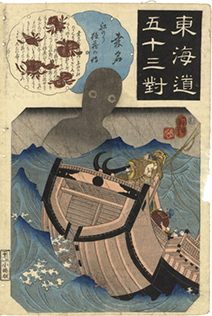 Si l'on souhaite remonter plus loin dans la représentation de l'Umi-bôzu avec des sources plus anciennes, il faut s'orienter vers deux peintres d'estampes. L'Umi-bôzu d'Utagawa Yoshinobu (1838-1890) est certainement l'une des estampes les plus connues sur cette apparition. Elle s'inspire elle-même d'une estampe d'un de ses maîtres, Utagawa Kuniyoshi (1797-1861).