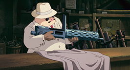 Après une nuit passée à l'hôtel, Porco se rend sur le continent pour régler quelques affaires. Alors que dans la rue une parade militaire bat son plein, il passe par la banque puis récupère sa mitrailleuse chez l'armurier. Un jeune vendeur lui propose les balles dernier cri ; mais soulignant qu'il ne fait pas la guerre, Porco repart avec ses munitions habituelles.