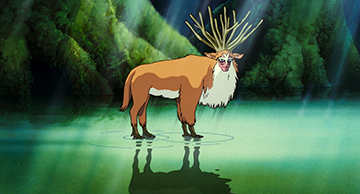Son comportement, qui pourrait passer pour de l'indifférence, cache en fait des intentions totalement étrangères à la pensée humaine. Le Shishi-gami est plus qu'une simple divinité. C'est l'incarnation de l'équilibre naturel. Il dispense la vie et la mort à sa guise, sans qu'aucun jugement de valeur n'entre en ligne de compte. L'agression de Dame Eboshi à son encontre brise l'équilibre et entraîne une cataclysme auquel rien ne résiste. Cette scène apocalyptique où la forêt meurt, où les Kodama tombent par milliers et où le corps décapité du Shishi-gami prend des proportions effrayantes, absorbant toute vie à son contact, est véritablement cauchemardesque. Tel un mauvais rêve, la scène paraît épouvantable et irréelle. Mais, lorsqu'il prend fin et que San et Ashitaka se réveillent, le monde a définitivement changé...