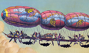 Reprenant l’idée du vieux rêve humain de pouvoir voler librement dans les cieux comme un oiseau, un cochon narrateur nous emmène à la rencontre de toutes ces machines volantes imaginaires, propulsées par l’énergie humaine et les progrès de la science, qui peuplaient l’imaginaire du début du 19ᵉ siècle. Tous ces engins, ballons, dirigeables et autres ornithoptères ont maintenant créé un embouteillage incroyable dans les cieux !