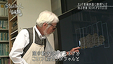 Hayao Miyazaki montre un dessin.