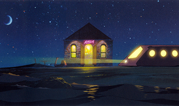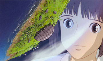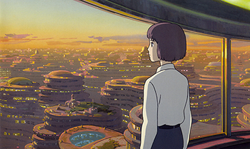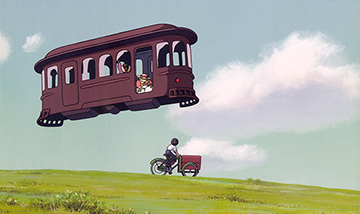 Takamatsu a donc créé tout l’univers du film en s’inspirant de ce tableau. Notamment le ciel, au niveau de ses couleurs, aux tons gris et verts, afin d’avoir un ciel peu lumineux mais ouvertement fantastique. Mais pour que ce ciel soit plaisant, il a délibérément utilisé le rose et le jaune pour les nuages.