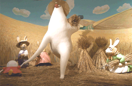 Comme dans le film, on peut voir des paysans lapins transformer du blé.