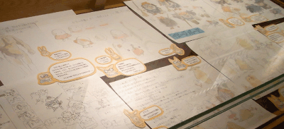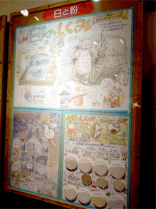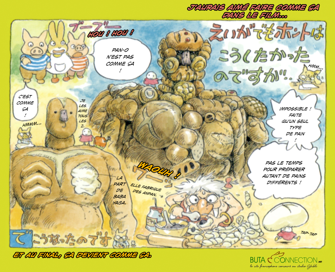 Un nouvel espace est alors dédié au film, dans lequel ont pouvait retrouver un diorama et divers affichages sur lesquels Hayao Miyazaki s’exprimait à propos de la récolte du blé, son processus de transformation en farine, puis en pains moelleux cuit au four. Il revenait aussi sur le moulin à eau vu dans le film, et sa propriétaire, Baba Yaga, par le biais d’illustrations inédites dessinées spécialement pour l’exposition (nous en avons traduites certaines en français pour cette page).