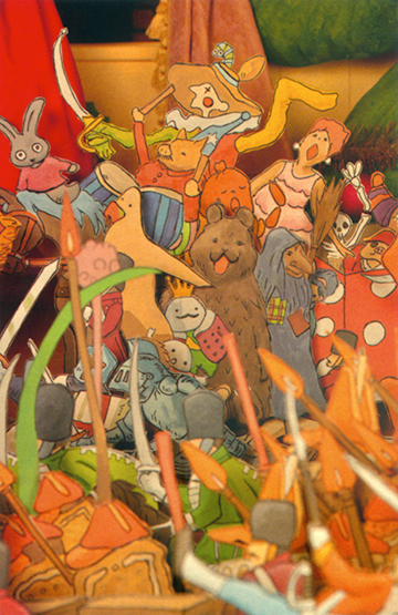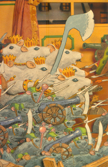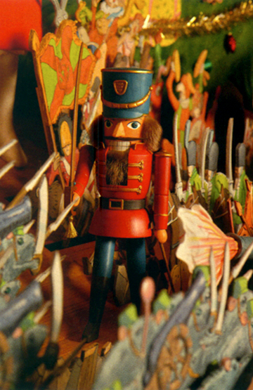 Le Casse-noisette de cette installation était une figurine en volume, contrairement aux armées de souris et de soldats composées de différentes couches de dessins.