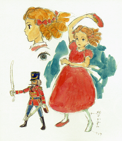 Drosselmeier, le parrain de Marie, est décrit comme un personnage assez mince dans le roman original, mais Miyazaki l’a dessiné assez rond, influencé par les illustrations d’Alison Jay.