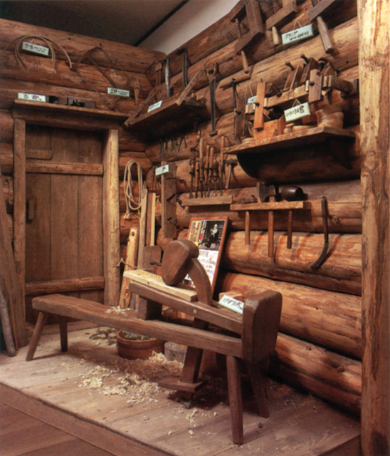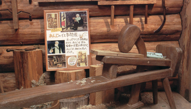 En plein milieu de cette reconstitution, on observe le principal outil de travail de l’Oncle de l’Alpe. Il lui sert à fixer ses planches de bois pour les travailler. Si on appuie sur la pédale, la tête descend et maintient la planche.