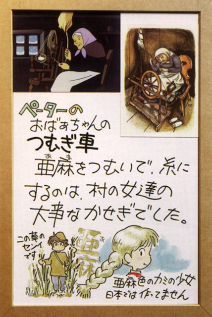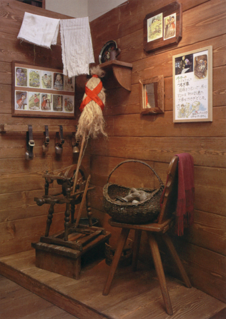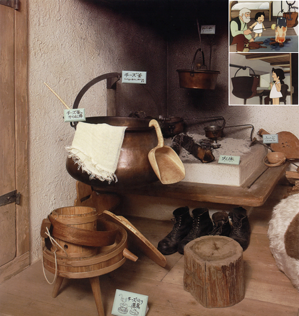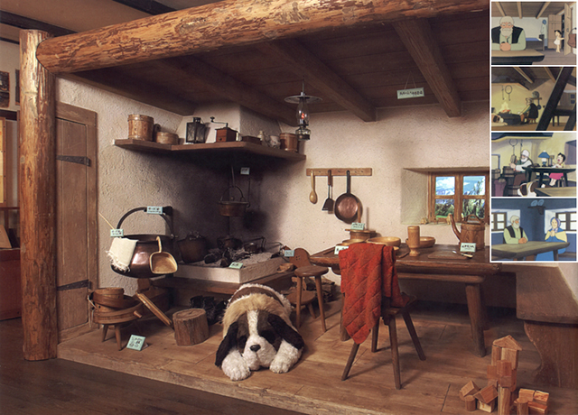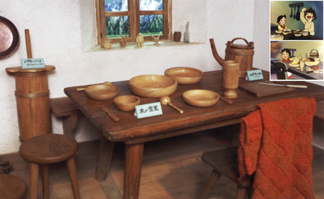 La table en bois du chalet et sa vaisselle. Au fond, à gauche, la machine à fabriquer du beurre de l’Oncle de l'Alpe.