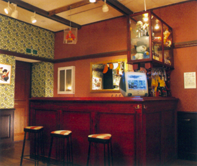Contre un mur du bar, divers produits dérivés Pixar sont entassés sur les étagères d'une bibliothèque.