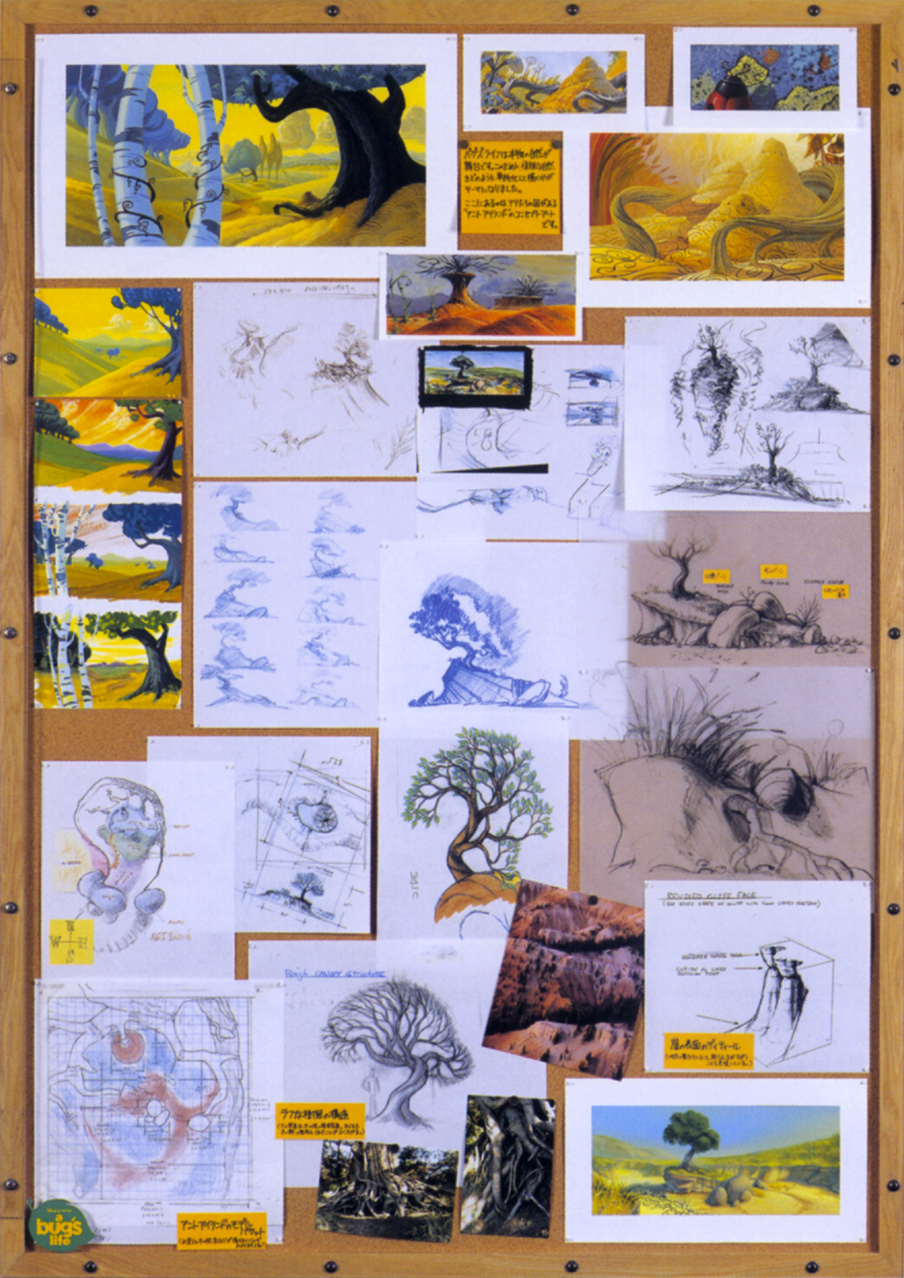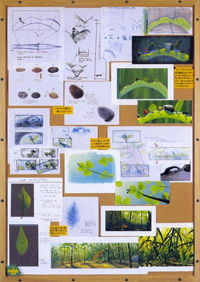 Chez Pixar, nous avons de nombreux artistes qui utilisent de nombreux outils différents, et tous sont essentiels au processus création des films. Notre studio fonctionne sur la collaboration, non seulement entre les gens, mais entre les médias. Alors que l’ordinateur produit les images finales visibles à l’écran, la majeure partie du travail qui entre dans le développement de l’histoire, des personnages et de l’apparence du film se fait sous formes traditionnelles - storyboard et design dessinés à la main, sculptures, peintures ou pastels.