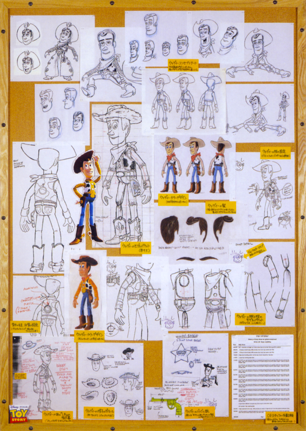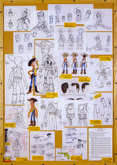 Concept art et planches de modèles détaillées de Woody (Toy Story).