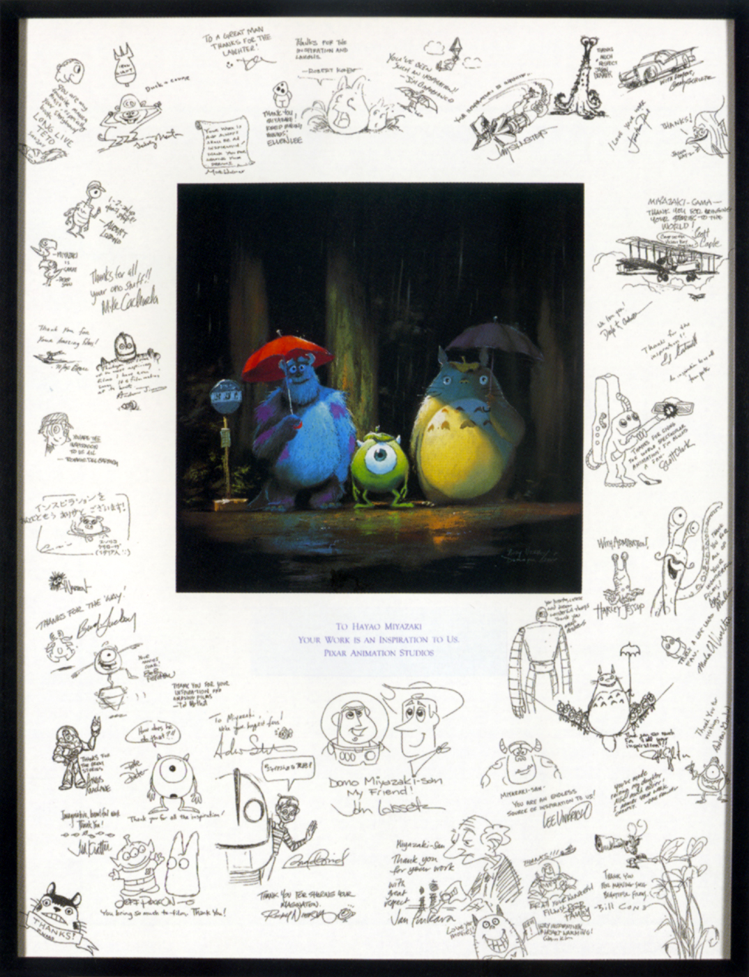 Affichage signé par l’équipe du studio Pixar, offert au studio Ghibli en 2002.