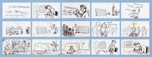 Storyboard expliquant « la répétition du travail du storyboard » chez Pixar, bureau de John Lasseter.