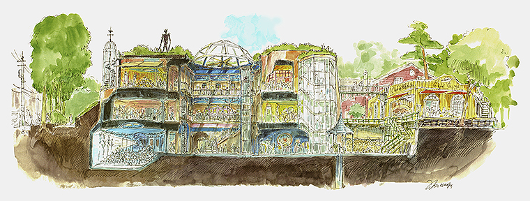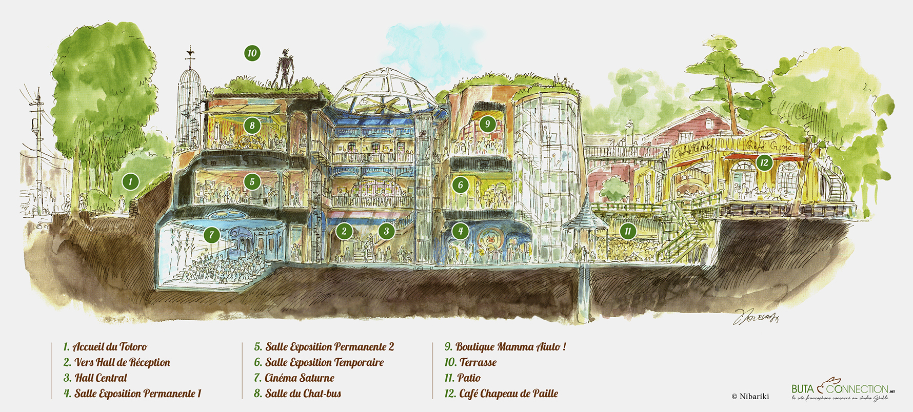 Cliquez pour agrandir le plan de coupe annoté du musée Ghibli.