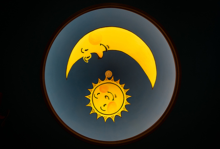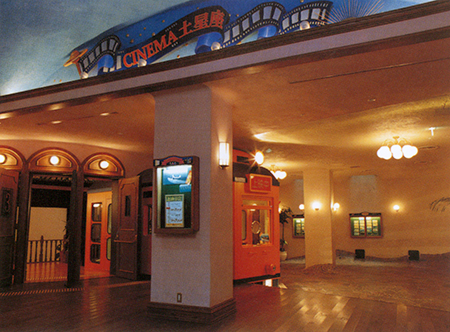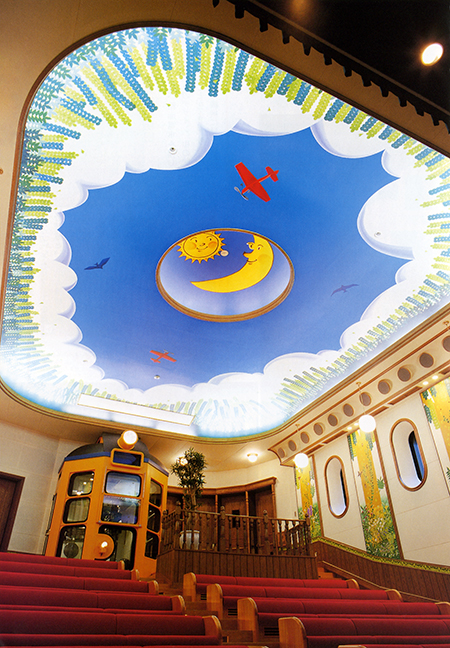 Quand le cinéma ouvre enfin ses portes, on rentre sagement et on admire la décoration de la pièce. Le plafond est bleu ciel avec un soleil, une lune et même l'avion de Porco Rosso ; les murs sont décorés avec des piliers, des hublots sont percées dans le mur gauche et sont fermées automatiquement au début de la projection par des panneaux qui s'intègrent très bien au décor.