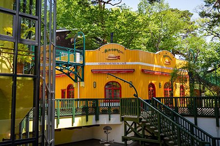 L'architecture du lieu rappelle celle du hangar à côté de l’accueil du Totoro, ce qui fait du café « Chapeau de paille » une bâtisse à part dans le musée Ghibli.