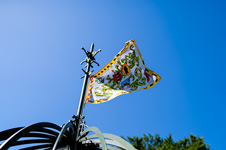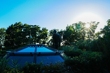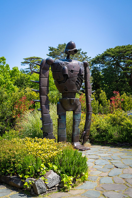 Sur le toit de l'édifice, se trouve une terrasse très verdoyante où un robot soldat de l’île volante de Laputa monte encore et toujours la garde.