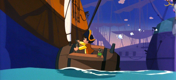 Vous savez qu’au Japon, pour l’animation TV, nous avons très peu de temps pour travailler. Par la suite, ce style graphique a été adopté tel quel par la télévision, et est devenu depuis une sorte de standard, mais sans aucune réflexion quant à sa pertinence. Sur Les joyeux pirates, j’ai travaillé pour répondre aux besoins du film, en réfléchissant à ce que tous ces effets présents sur la surface de l’eau, comme les ondes ou le ressac, aient une cohérence. Or, dans ces reprises, les sensations que j’avais essayé d’introduire ne s’y retrouvent pas. Lorsqu’on est sur un projet donné, il faut se poser ces questions de nécessité graphique : « De quoi le projet à besoin ? Quelles sont les directions à explorer ? »