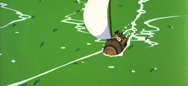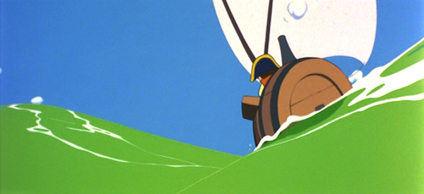 Nous avions besoin de créer une forme pour dépeindre la mer, presqu’un personnage principal du récit, qui posait un défi. Nous aurions pu rester inscrit sur la forme très réaliste que nous avions sur Horus, mais c’était un travail considérable et très difficile pour les animateurs. Et le réalisateur, M. Hiroshi Ikeda, qui est également quelqu’un de notre promotion, entré en 1959 à Tôei, m’a accordé un mois de délais pour réfléchir à une forme et une manière de simplifier les vagues pour permettre à toute l’équipe de travailler sur l’image, et en même temps qui convienne à la légèreté du récit. J’ai donc joué sur la transparence pour que ce soit accessible à tous les animateurs. C’est cette énergie, comme une libération qu’avait représenté le poids du travail précédent, qui, je crois, a donné naissance à la représentation que vous avez vu dans l’extrait.