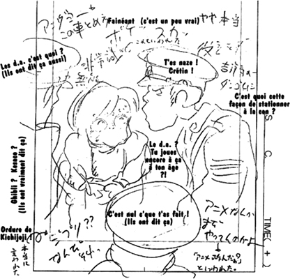 Dessin de Hayao Miyazaki représentant Hirokatsu Kihara se faisant interroger par la police pour une infraction au stationnement. Il est interdit de se garer devant l’entreprise, mais ce jour-là, Kihara s’y était garé dans son empressement pour aller au travail (extrait du Roman Album de Mon voisin Totoro).