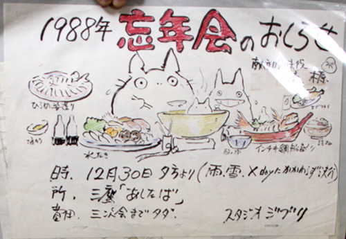 Une affiche destinée aux employés du studio dessinée par M. Miyazaki pour annoncer la fête de fin d’année de 1988. Il y est écrit que Hirokatsu Kihara est le responsable de la fête. Le nom du directeur artistique, Kazuo Oga, y a été ajouté pour faire une blague.
