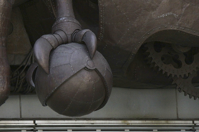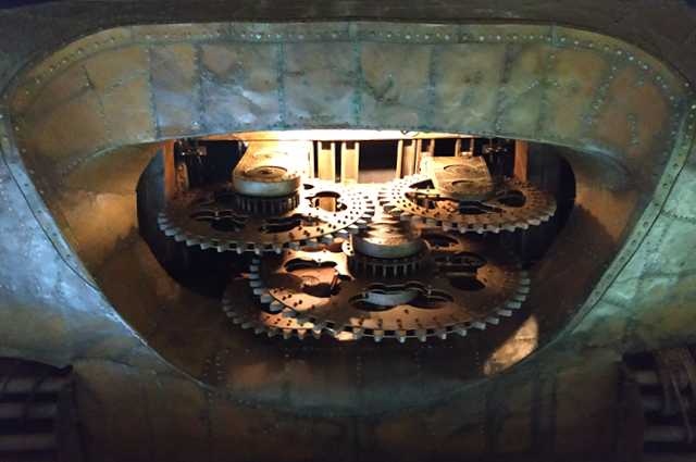 Plusieurs fois par jour, à heure fixe, l’horloge prend vie et s’anime. Une sonnerie retentit, indiquant le début du spectacle. Les automates des familles Cloche et Forgeron (voir encadré) débutent leur travail de mise à l’heure de l’horloge au rythme d’une valse. Tout d’abord, les aiguilles bougent en dissonance puis terminent leur chorégraphie en indiquant le début d’une heure nouvelle. La tourelle à canons tire une salve de vapeur d’eau puis un gong retentit qui signalent la fin de cette synchronisation. Pendant quelques instants, les globes enserrés dans les membres avant dévoilent une horloge coucou et un cycle solaire calendaire cachés. Puis les automates s’immobilisent et temps reprend son cours.