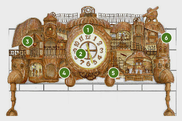 Grâce au travail respectif de ces deux familles, l’horloge peut afficher l’heure exacte au tir de sa tourelle à canons et au bruit du gong.